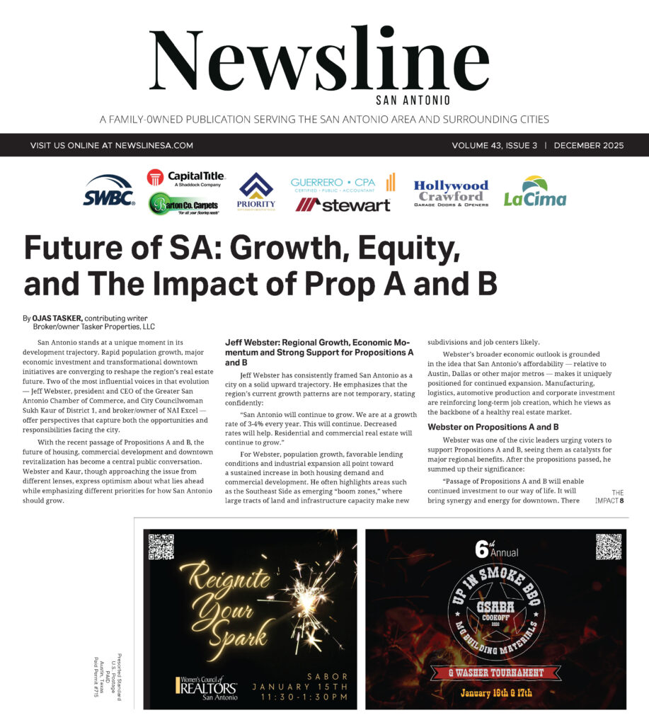 Connect your brand with San Antonio’s most influential real estate professionals through Newsline San Antonio — the region’s premier real estate trade newspaper. Our readers are active agents, brokers, developers, and industry leaders who trust us for the latest market news and insights. Advertising with us puts your message directly in front of the decision-makers driving local real estate. Whether through print, digital, or sponsored content, we help you build visibility, credibility, and results where it matters most — in the San Antonio real estate community.
