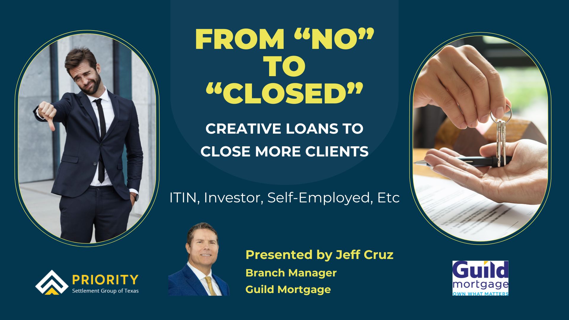 Learn about various loans to help clients that don't meet standard lending criteria. Jeff Cruz will cover loans for Investors, Doctors, Self-Employed, ITIN, Bank Statement Loans, and more. When: January 20 at 11 a.m.Where: Priority Title - 3619 Paesanos Pkwy Suite 210 |